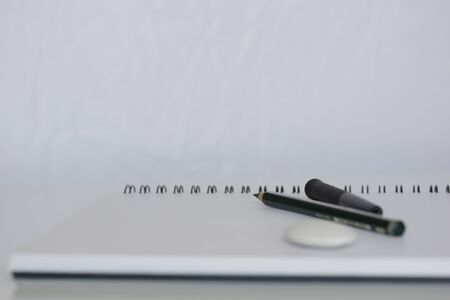 Pencil and notebook with space for text or image, selective focus. Blank notebook with pencil on white desk background.