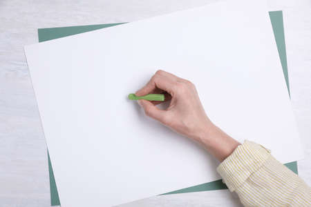 Woman drawing on paper with pastel at white wooden table, top view