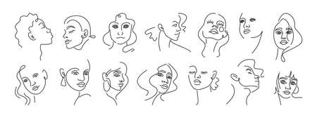 Woman faces doodles in abstract design, trendy set. Vector beautiful portraits, abstract doodle modern fashion vogue face with hairstyle. Lady head beauty minimalist, print graphics design style