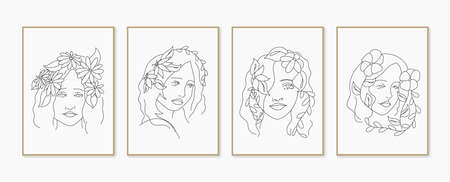 Line woman portrait set of abstract aesthetic minimalist hand drawn contemporary posters. Abstract Art design for print, wallpaper, cover. Modern vector illustration.