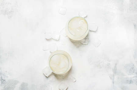 Alcohol Cocktail Prosecco On The Rocks With Sparkling Wine And Ice Cubes, Gray Background, Top View