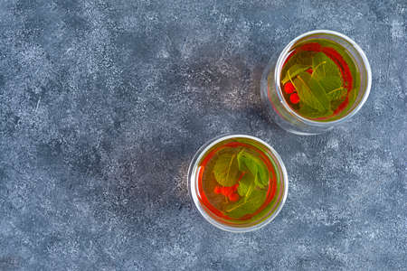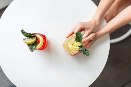 Fresh summer carbonated red berry drink and cold lemonade with mint on a white table. Woman holds and drinks delicious lemonades in a cafe on the terrace, top view