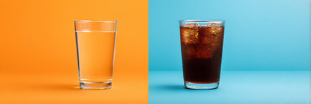 A glass of clear water sits next to a glass of dark soda filled with ice, both placed against vibrant colored backgrounds.