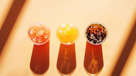 Top view of an assortment of aesthetic bubble teas. Drink with tapioca bubbles. Strong shadows. Generative AI.
