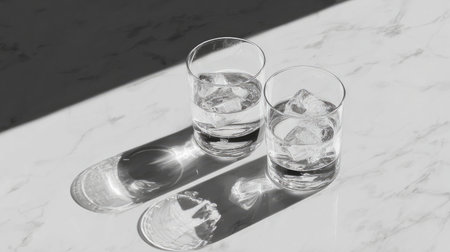 Two clear glasses filled with ice sit on a white marble surface. Soft shadows create a striking black and white visual, conveying elegance and simplicity.