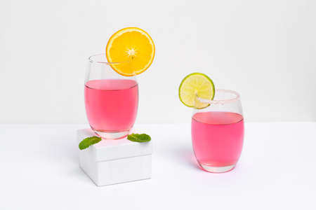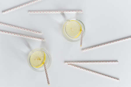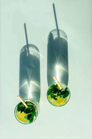 top view of summer fresh drink with lemon, mint and lime on white background, isolated. cool infused water for seasonal hot weather. shadows and sun reflects.