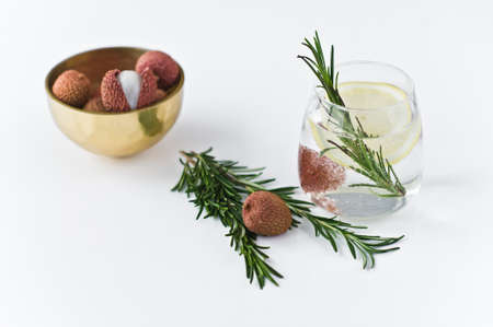 Glass of clean mineral sparkling water with ice and lemon on a white background with sunshine