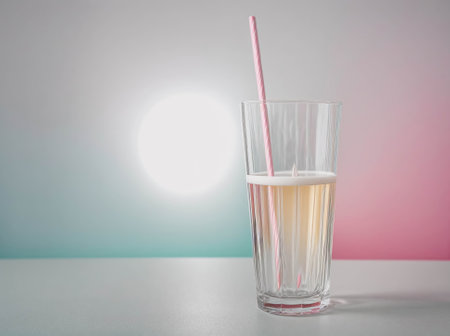 A vibrant arrangement of colorful summer drinks with ice cubes and straws placed on a split pastel pink and blue background for a refreshing theme.
