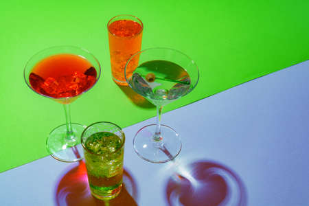 Alcoholic cocktails in assrtment. Top view, flat lay. Photo collage