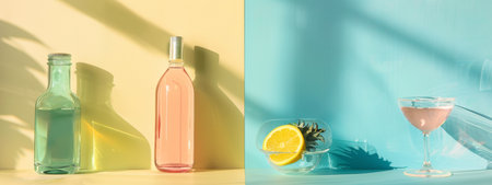 A minimalist composition featuring glass bottles and citrus slices, with strong shadows cast on a pastel-colored background. The simplicity of the scene highlights the clean lines and fresh elements.