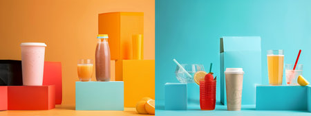 A vibrant composition featuring colorful beverages and packaging arranged on contrasting orange and blue backgrounds, creating a dynamic and eye-catching display perfect for marketing and advertising themes.