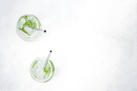 Beautiful glass of water or mojito with lime and mint cocktail on the gree background and white table summer vibe and atmosphere