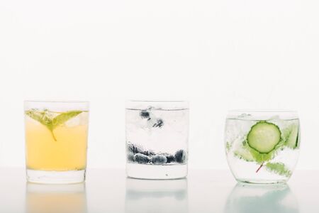 refreshing drinks with blueberries, mint, cucumber and ice isolated on white