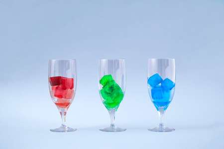 Creative concept of three wine glasses with rgb ice in them. Ice red, green and blue cocktails on grey background.