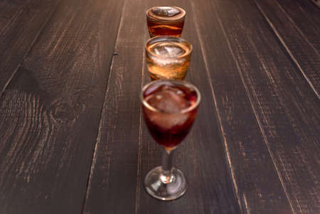 Alcoholic drinks in glass piles on a wooden table. Cherry, nut and lemon liqueurs.