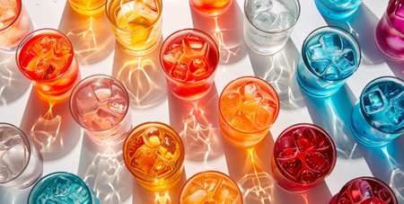 Trendy Collection of colorful iced drinks with sparkling reflections Flat lay.