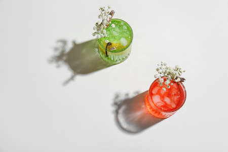 Glasses with tasty cocktail and beautiful gypsophila flowers on white background