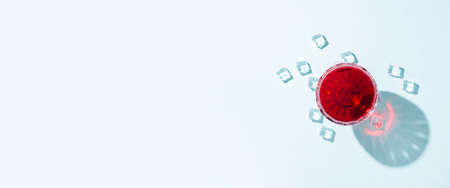 Close-up of red liquid drink in recycled glass bottle with diagonal shadow over celeste blue and white background. National Day concept. Copy space ready to add text.