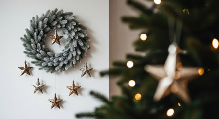 A festive Christmas scene featuring a decorative wreath adorned with stars on a light background, paired with a blurred view of a Christmas tree illuminated with lights and a star ornament.
