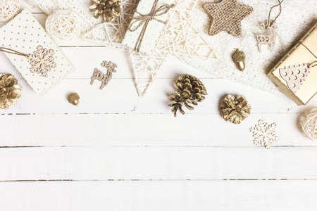 Christmas or winter composition. Christmas gifts, pine cones, knitted blanket and ornaments on white wooden background. Flat lay, top view, copy space.