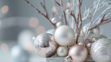 Discover an elegant holiday decoration featuring shimmering ornaments, frosted branches, and soft lights, perfect for inspiring your festive spirit and seasonal celebrations.