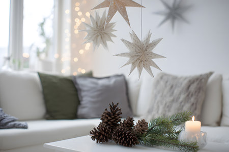 Cozy living room in Scandinavian style decorated with New Year decor. Photo