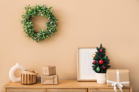Beautiful Christmas tree with wreath and gift boxes near beige wall