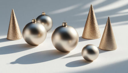 Matte golden christmas baubles stand with textured cone trees on bright surface. Long shadows from side light create elegant minimal holiday decor.