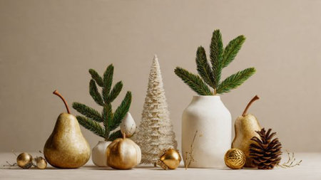 This elegant collection showcases various Christmas ornaments and decorations, featuring gold and white accents alongside natural greenery, perfect for the festive season.
