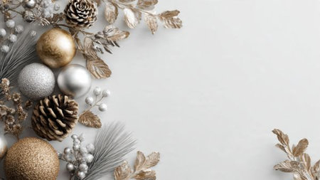 A beautifully arranged collection of Christmas ornaments, natural foliage, and decorative elements on a textured background, ideal for seasonal design projects and holiday themes.