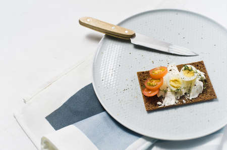 Quail egg toast. Ingredients tomatoes, egg, cheese, rye bread. White background, side view