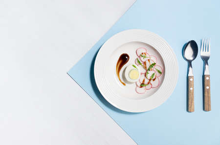 Fresh vegetarian salad of radish, arugula and eggs with cutlery, teriyaki sauce art plating on white wood table, blue color with shadow in sunlight, flat lay. Colorful modern geometric style food background.