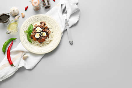 Plate of delicious rice with mushrooms on light background