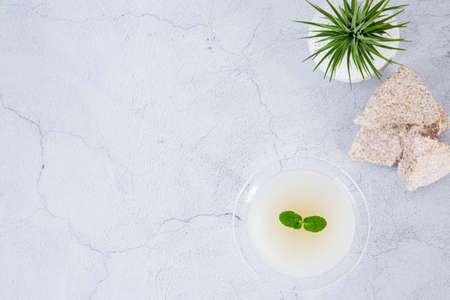 Basil and ginger limeade in two glasses, overhead view minimal composition with a space fpr a text