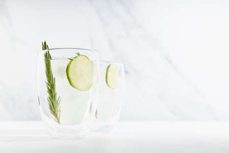 Fresh citrus infused homemade lemonade with ice cubes, lime slices, green rosemary twig in two mugs in soft light white kitchen interior in sunny day.