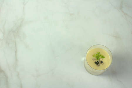 Glass of Vichyssoise (traditional French leek, potato and onion soup) with green pepper topping and assorted seeds on white marble. Copy space. Top View.