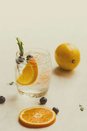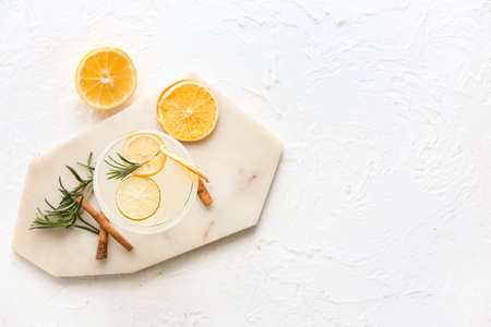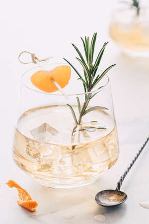 Close-up of a classy tangerine and rosemary Old Fashioned drink white marble background