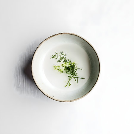 Dill soup in bowl on white background. Flat lay, top view. Minimal style.