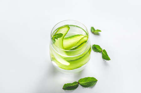 Fresh layout of mint leaves, lemon slices and drink in a glass. Cocktail spring concept with shadow. Bright drink arrangement.