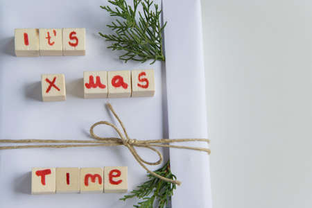 Top view of white handcraft gift box with It's x mas time text (wooden letters) and fresh fir branches on white background, seasonal celebration and eco-friendly concept