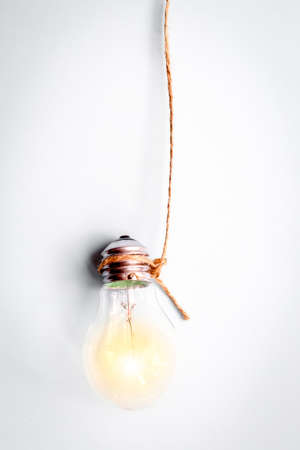 Warm light, led lamp in an antique lamp on a white wall in a minimalist style with copy space.
