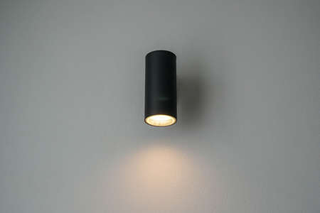 Glowing modern wall led lamp with warm light on white wall. Free space