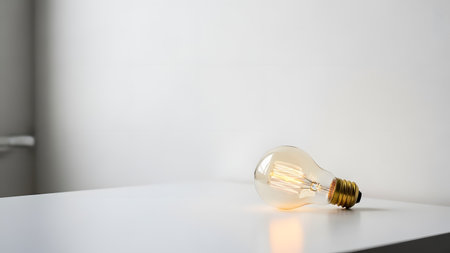 A vintage Edison-style light bulb lies on its side on a white surface, glowing with a warm orange filament. The minimalist composition symbolizes ideas, innovation, and creativity.
