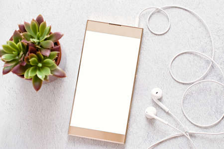 Blank screen smartphone on concrete desk with white earphones, succulent plant, top view, copy space. Gadgets and home decor on grey table