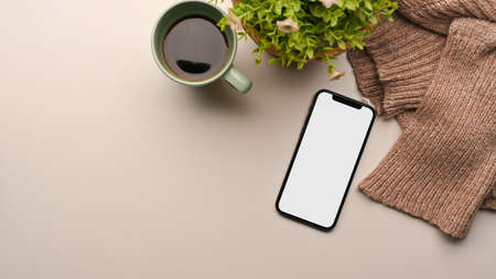 Copy space on natural pastel beige background with smartphone screen mockup, coffee, knitted sweaters, top view