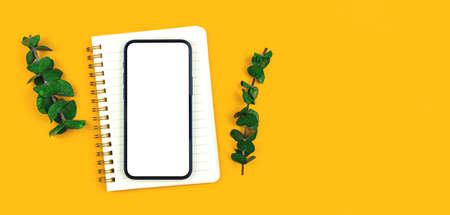 Web banner with sprigs of eucalyptus on blue background and notepad.