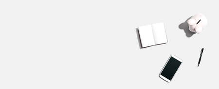Top view of smartphone and tablet on white table accessories and coffee cup