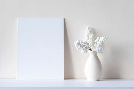 Soft light composition with blank canvas or sheet, vase, decorative house plant on a desk. White room interior, minimal mockup with space for text