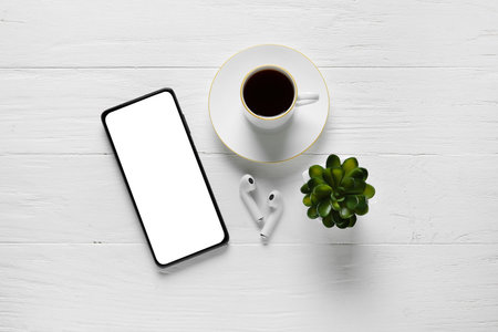 Modern mobile phone, earphones, houseplant and cup of coffee on light wooden background