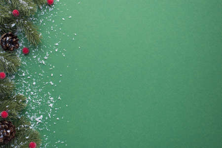Top view photo of snowy pine branches with cones and red berries on isolated green background with blank space
